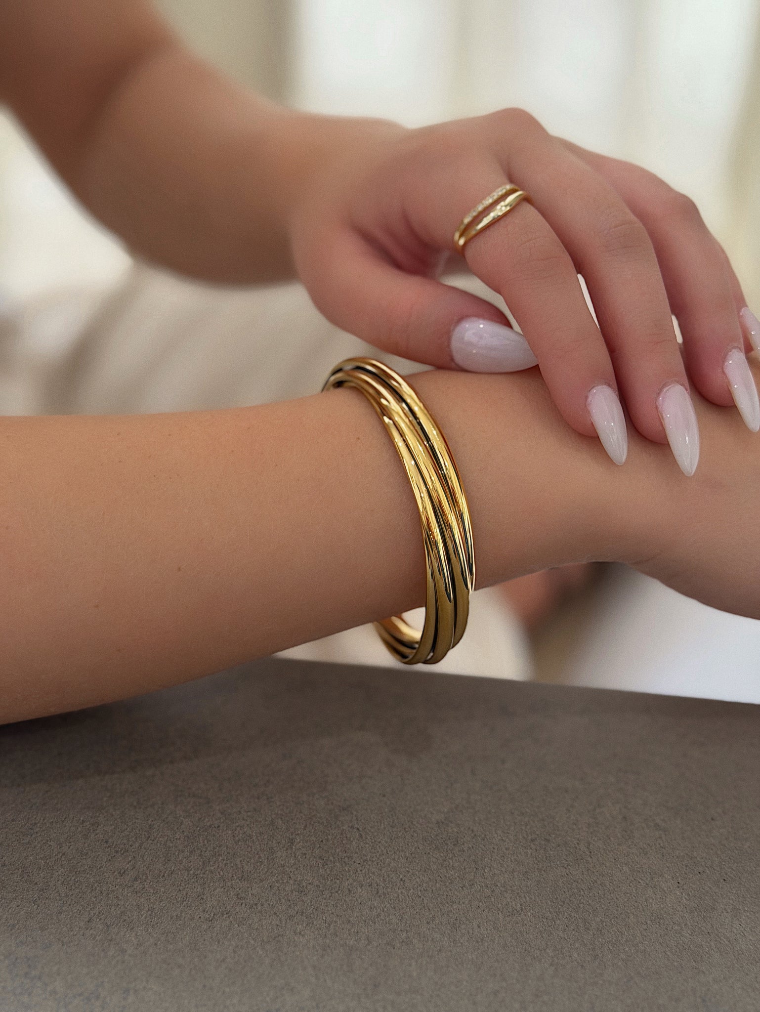 The BRUNA Bracelet featured triple bangle with 14K Gold Plated over Stainless Steel.
