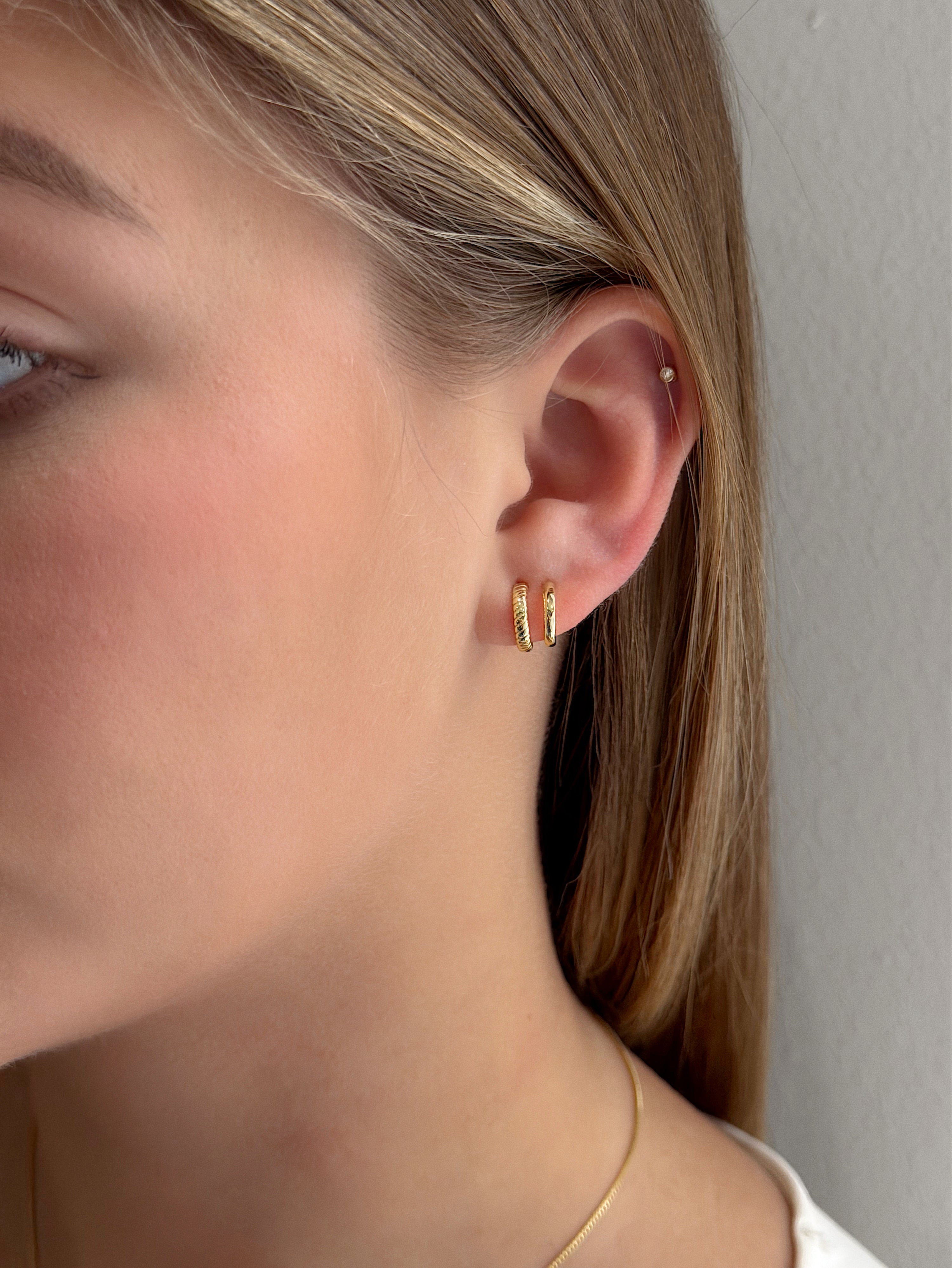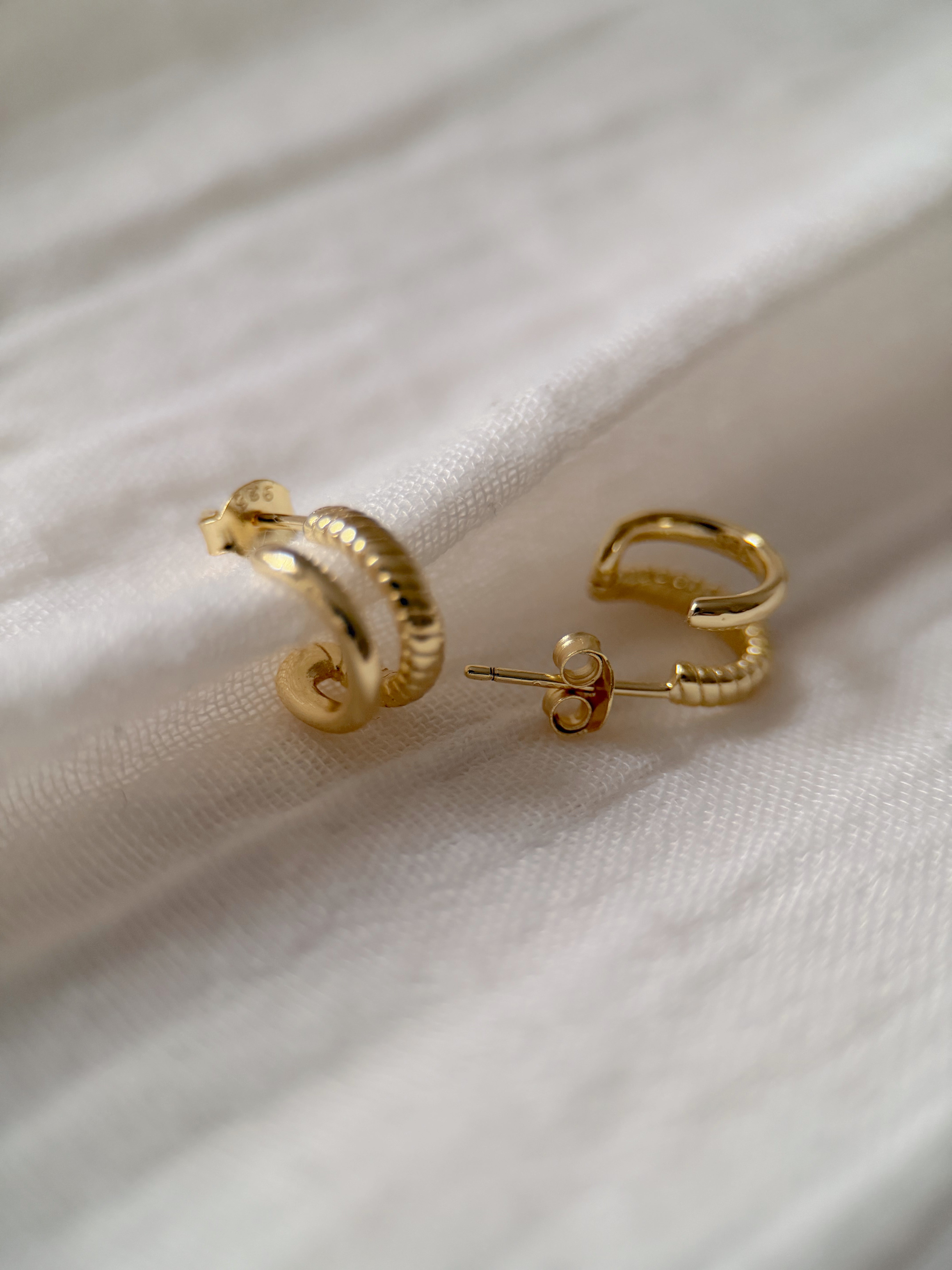 The MAVIS double hoop earrings featured 925 Sterling Silver with 14K Gold plated. An extra layer of tarnish resistance( E-coating) is added to extend the life span of our Jewelry.