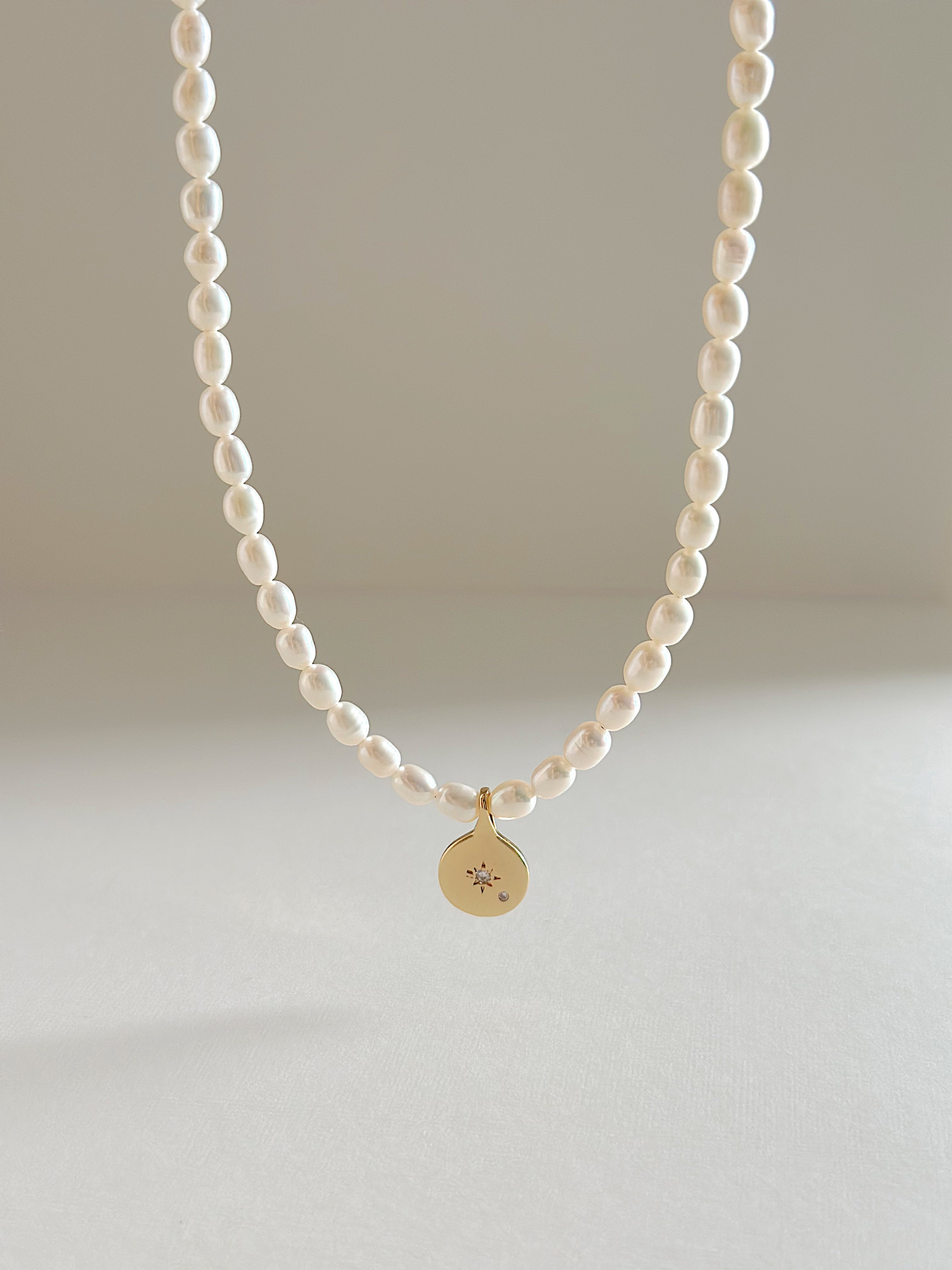 The PORTIA Necklace featured Freshwater rice pearl grade B with a 18K Gold Filled pendant. Portia is designed to highlight the beauty of your neckline.